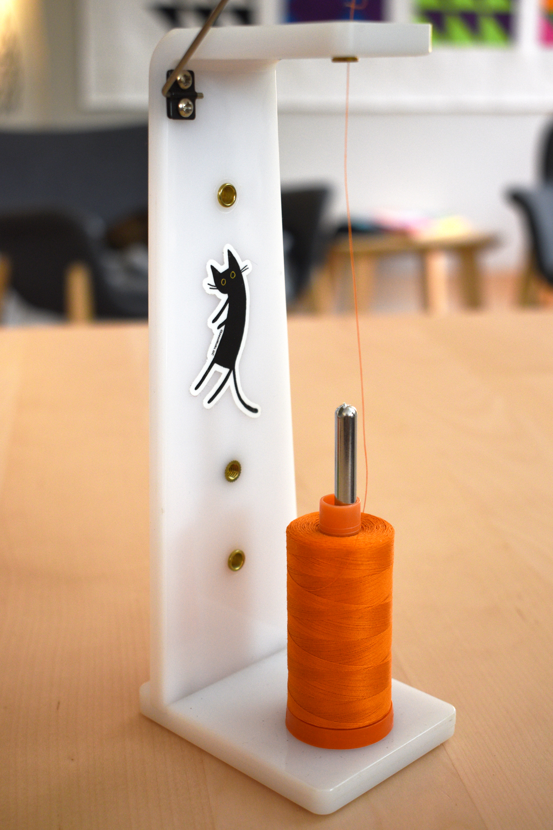 Place a thread stand to the side or behind your machine, wherever it is clear of any moving parts of the machine and out of the way as you sew.